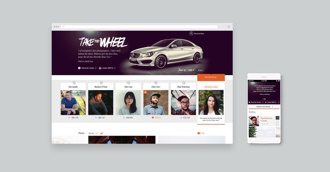 The campaign challenged five of Instagram’s most successful photographers to take a brand-new CLA for a road trip across some of the most beautiful parts of the United States. Throughout the trip they were asked to post inspiring photos of the cities, landscapes, and people that they encountered. Instagram users voted for their favorite photographers by liking individual photos. The stakes were high, because the photographer who got the most likes got to keep the CLA. Emerge Interactive developed the campaign’s hub, integrating with multiple APIs to create a real-time dashboard of the contest’s progress, allowing visitors to view the photos taken, track the photographers’ locations, and stay on top of the voting results as they were compiled from various sources.