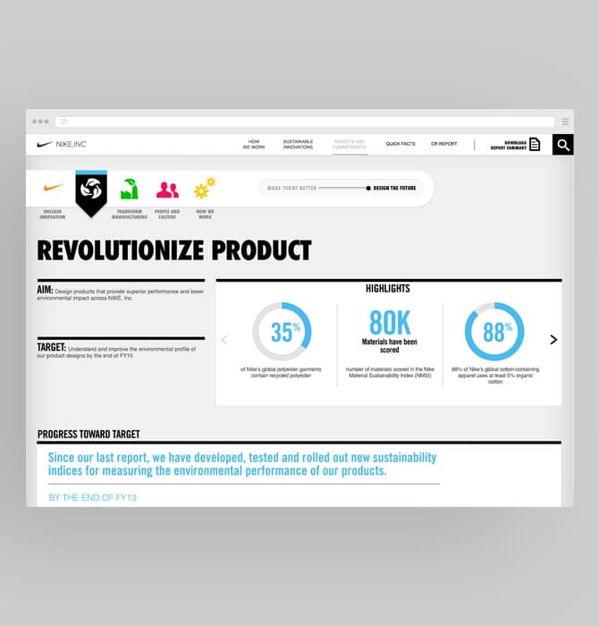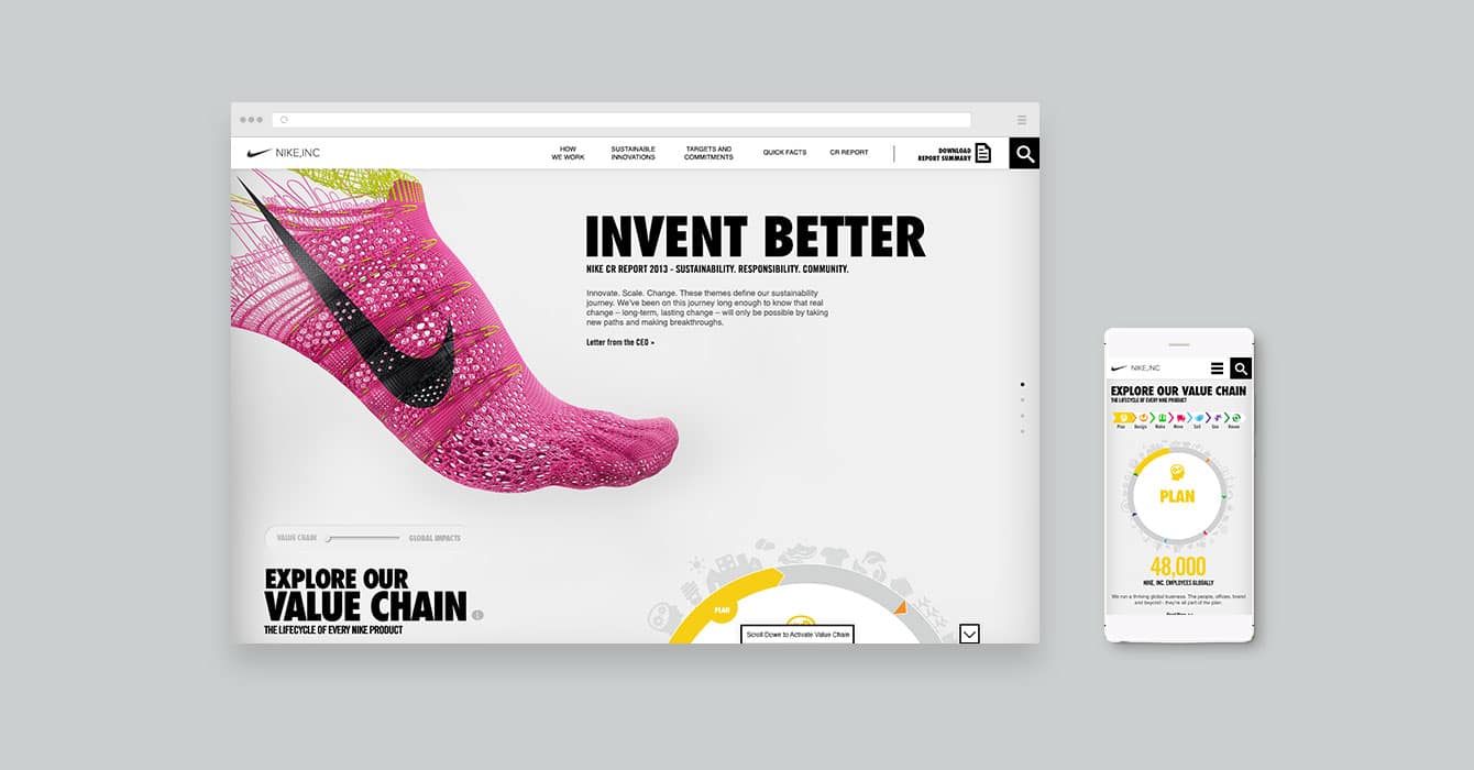 Working with Nike gave us the opportunity to create a game-changing experience that took Corporate Responsibility and Sustainability Reporting to a whole new level. We did this by creating responsive desktop, tablet, and mobile experiences that engage users by taking them on a journey through the Nike value chain.